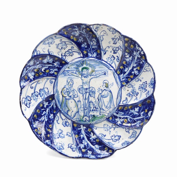 La maiolica rappresenta una delle espressioni più alte della cultura rinascimentale italiana, testimonianza dell’ingegno e della sensibilità creativa degli artisti del tempo. Ne costituisce un esempio significativo la coppa di Montelupo, eseguita a metà del XVI secolo, decorata nel recto con la scena della Crocifissione. Attorno, nella tesa, si dispongono eleganti partizioni che racchiudono tralci di quercia stilizzati su fondo bianco e blu nel genere cosiddetto “a quartieri”.