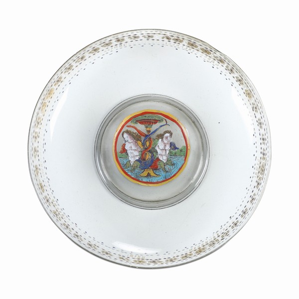 Il catalogo inoltre include un raro esempio di arte vetraria veneziana: una coppa in vetro incolore, eseguita tra la fine del XV e l’inizio del XVI secolo, decorata a smalti policromi con due figure mitologiche – probabilmente tritoni o geni acquatici – immerse in un paesaggio fluviale stilizzato. Il linguaggio figurativo rivela un affascinante dialogo tra tradizione tardo-gotica e suggestioni rinascimentali, tipico della produzione muranese del periodo.