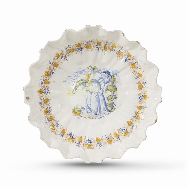 Dalla tradizione di Faenza proviene invece un’importante coppa compendiaria databile al penultimo quarto del XVI secolo, caratterizzata da una parete modellata a stampo e da una figura femminile stante al centro, raffigurata mentre regge un cesto ricolmo di frutta. L’immagine, interpretabile come allegoria dell’abbondanza o come rappresentazione di Pomona, dea romana della coltivazione e della cura dei frutteti.