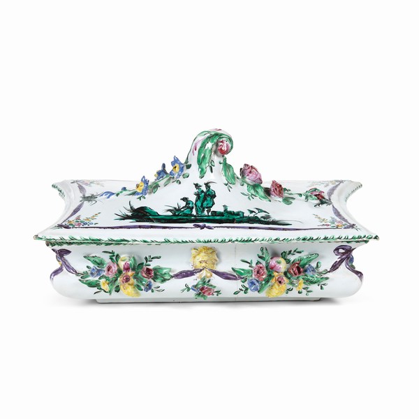 Il percorso prosegue nel Settecento con una rara legumiera faentina dipinta da Filippo Comerio presso la Fabbrica Ferniani. L’opera, con la sua elegante forma rettangolare e il coperchio sormontato da una presa rococò, è arricchita da festoni a rilievo e da un mascherone leonino. Le scene dipinte sul coperchio testimoniano la cifra stilistica dell’artista, interprete sensibile del gusto arcadico, espresso con freschezza pittorica.
