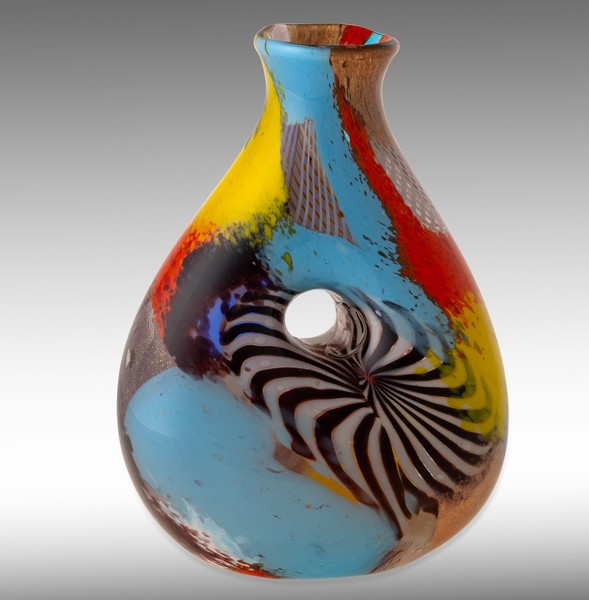 Di Ercole Barovier sono presenti alcuni pezzi eccezionali per invenzione e tecnica esecutiva, usciti dai forni della Barovier&Toso. L’esemplare più notevole è il vaso a sezione quadrata con grandi murrine multicolori, probabilmente pezzo unico eseguito nei primi anni ’60 (Lotto n. 129 - 6.000-8.000 €).
