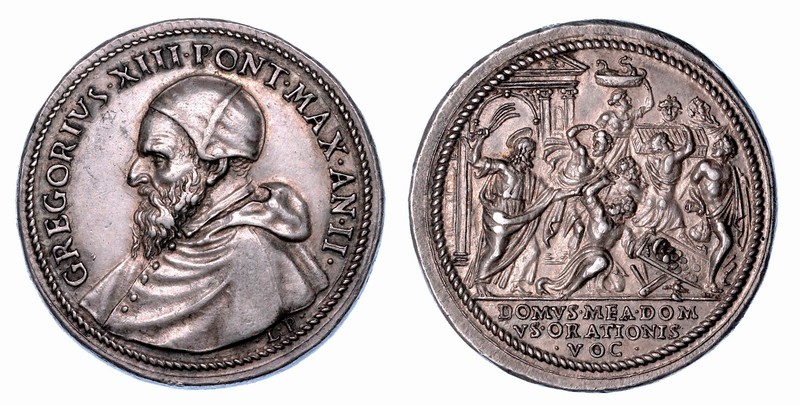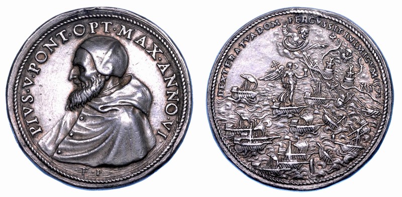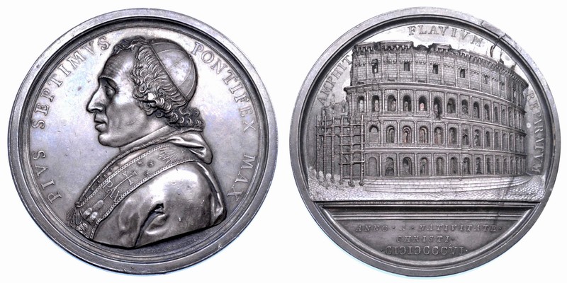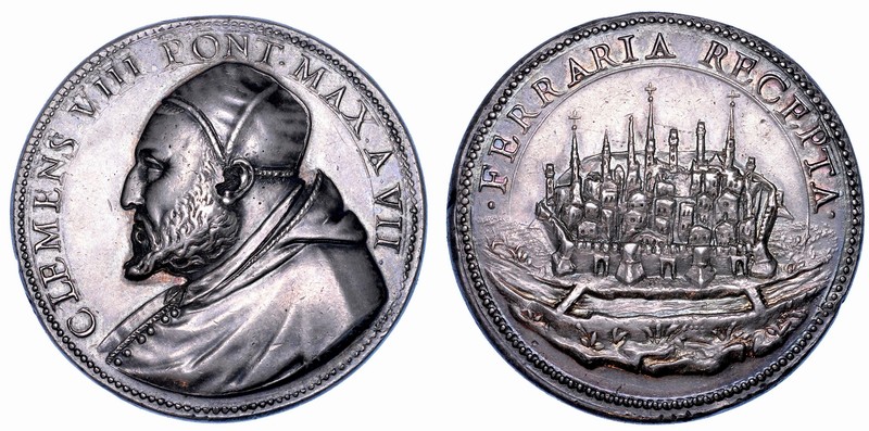 Tra i pezzi di maggior pregio spicca una medaglia in argento di Pio VII (lotto 1177), datata 1807, raffigurante i lavori di restauro del Colosseo. La perizia incisoria di Mercandetti si esprime in modo straordinario, rendendo con minuziosa precisione tutti i dettagli architettonici della facciata dell'Anfiteatro Flavio. Altro esemplare di grande rilievo è la medaglia di Clemente VIII (lotto 878), coniata nel 1598 per celebrare la devoluzione del Ducato di Ferrara nei domini pontifici, un evento storico di grande importanza politica, splendidamente immortalato da Giorgio Rancetti. Di notevole interesse storico e iconografico è anche la medaglia di Gregorio XIII (lotto 854), dedicata alla riforma del clero cattolico, mentre la medaglia di Pio V (lotto 846) ricorda con intensa forza narrativa la vittoria della Lega Santa nella battaglia di Lepanto del 1571, uno dei momenti più emblematici della storia cristiana e occidentale.