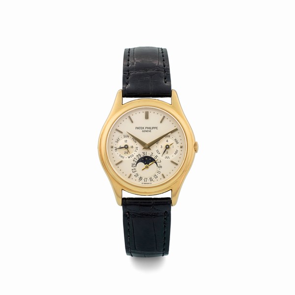 Sempre dalla casa Patek Philippe, il Calendario Perpetuo ref. 3940J, un neovintage del 1988 in oro giallo, rappresenta un pezzo unico per i collezionisti. Con un raro quadrante della seconda serie e condizioni eccellenti, è offerto con una stima tra 35.000 e 50.000 euro.