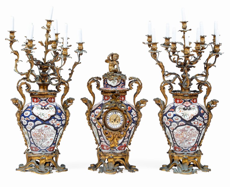 Lotto 347 – Trittico da camino in porcellana Arita, Giappone, fine XVII secolo, con montature francesi in bronzo dorato d’epoca Napoleone III.