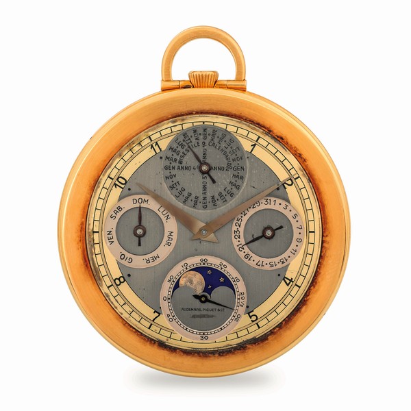 - Un elegante orologio da tasca Audemars Piguet con calendario perpetuo e fasi lunari (lotto 94), datato circa 1930, è stato venduto a 65.100 euro, partendo da una stima di 15.000–18.000 euro.