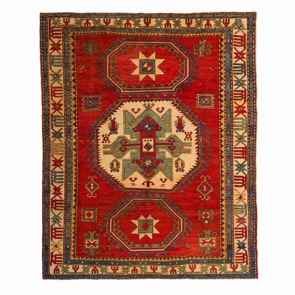 Accanto a esso si distingue un raffinato tappeto Lory Pambak del Caucaso di fine XIX secolo, riconoscibile dal medaglione centrale bianco affiancato da due medaglioni minori con motivo a stella, dal campo rosso essenziale e dall’elegante bordura con pettine e stelle.