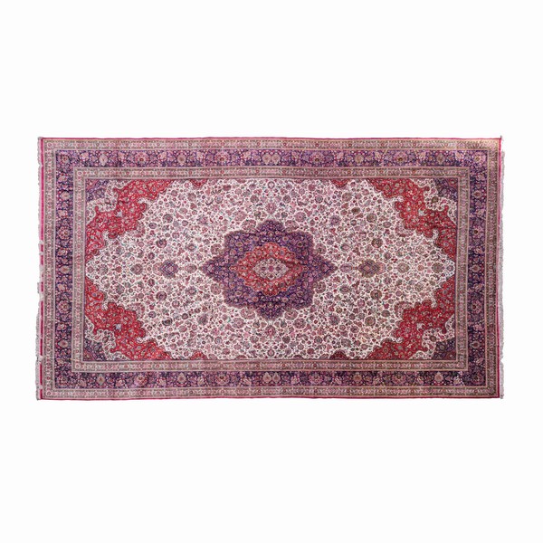 Di grande finezza tecnica è il tappeto Ghom in seta, Persia XX secolo, con campo chiaro impreziosito da un medaglione polilobato rosso e blu e firmato dal maestro Herami.