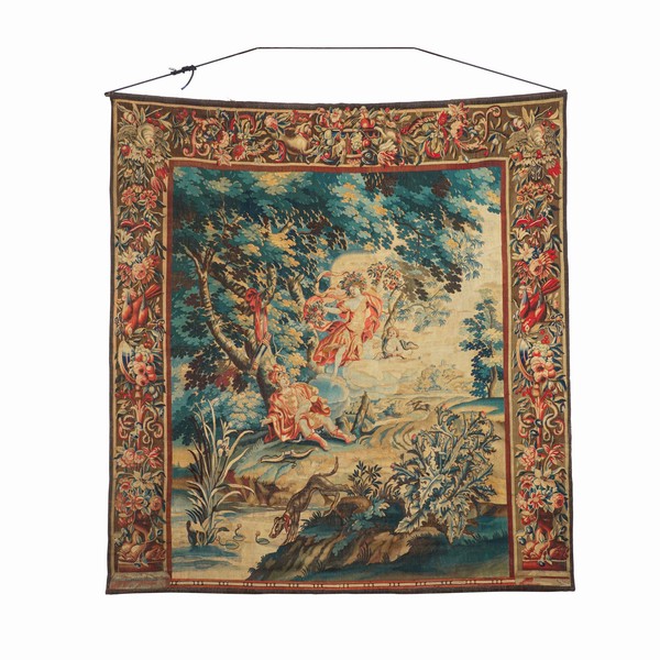 Tra gli esemplari di maggior pregio spicca un raro arazzo fiammingo dei primi anni del XVIII secolo, raffigurante Narciso e la ninfa, opera di grande formato che testimonia l’eccellenza della manifattura nord-europea.