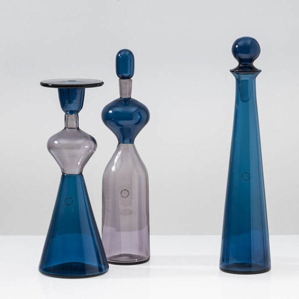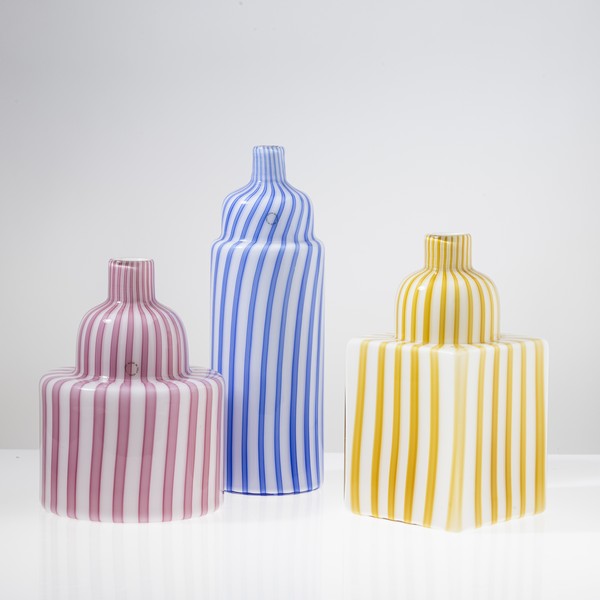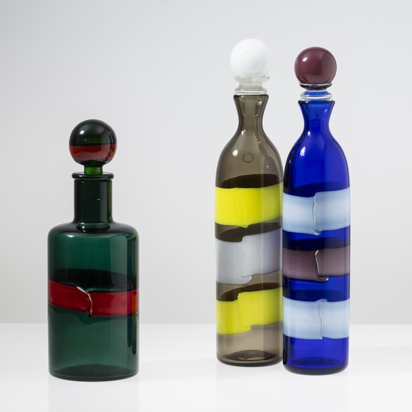 Dello stesso periodo è la serie Bolle, presente nel Lotto 27 con cinque bottiglie prodotte tra il 1989 e il 2008. L’uso raffinato dell’incalmo, unito alla varietà cromatica e alla coerenza progettuale, rende questo gruppo una delle testimonianze più rappresentative della sensibilità Venini tra la fine del secolo e l’inizio del nuovo millennio; anche in questo caso la stima è 3.000 – 4.000 euro.