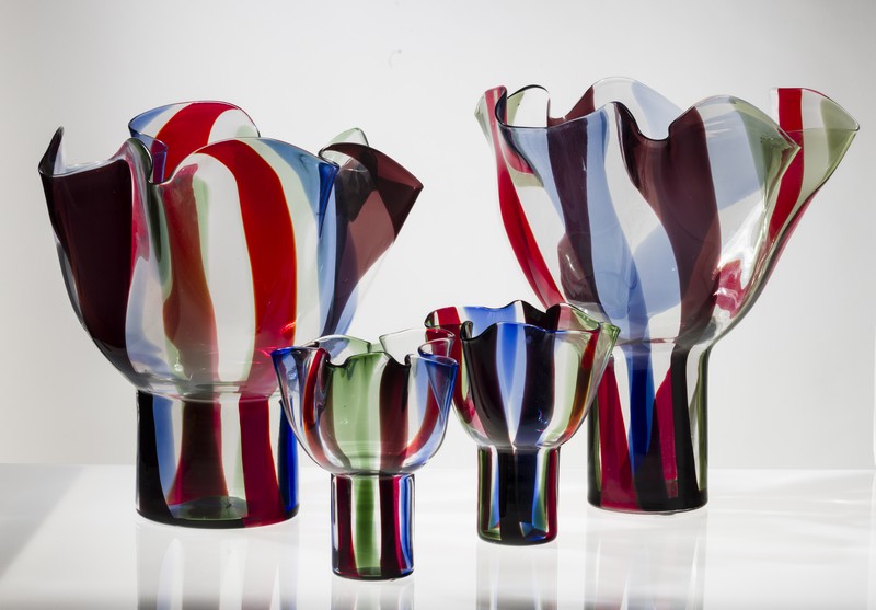 Tra le testimonianze più significative delle radici storiche della manifattura spicca una collezione di quattro vasi della serie Tessuti di Carlo Scarpa e Paolo Venini e realizzata intorno al 1980. Presenti in asta come Lotto 6, queste opere in vetro soffiato – caratterizzate da canne bicolori e dalla tradizionale superficie battuta alla mola – documentano la persistenza dell’eredità scarpiana nella produzione contemporanea e sono stimate 5.000 – 6.000 euro.