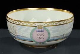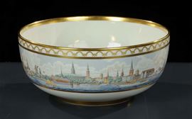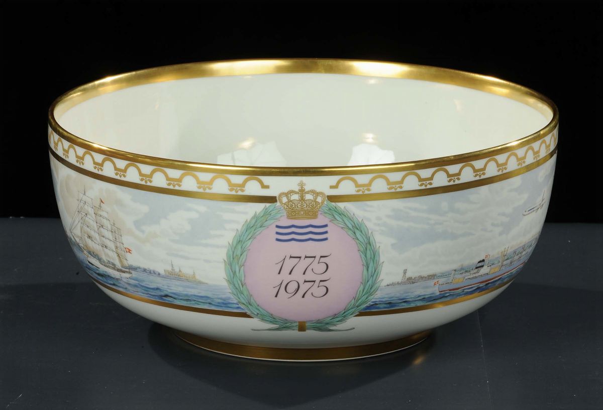 decorato in policromia con vedute di cittˆ costiere, bordo dorato, diametro cm 34