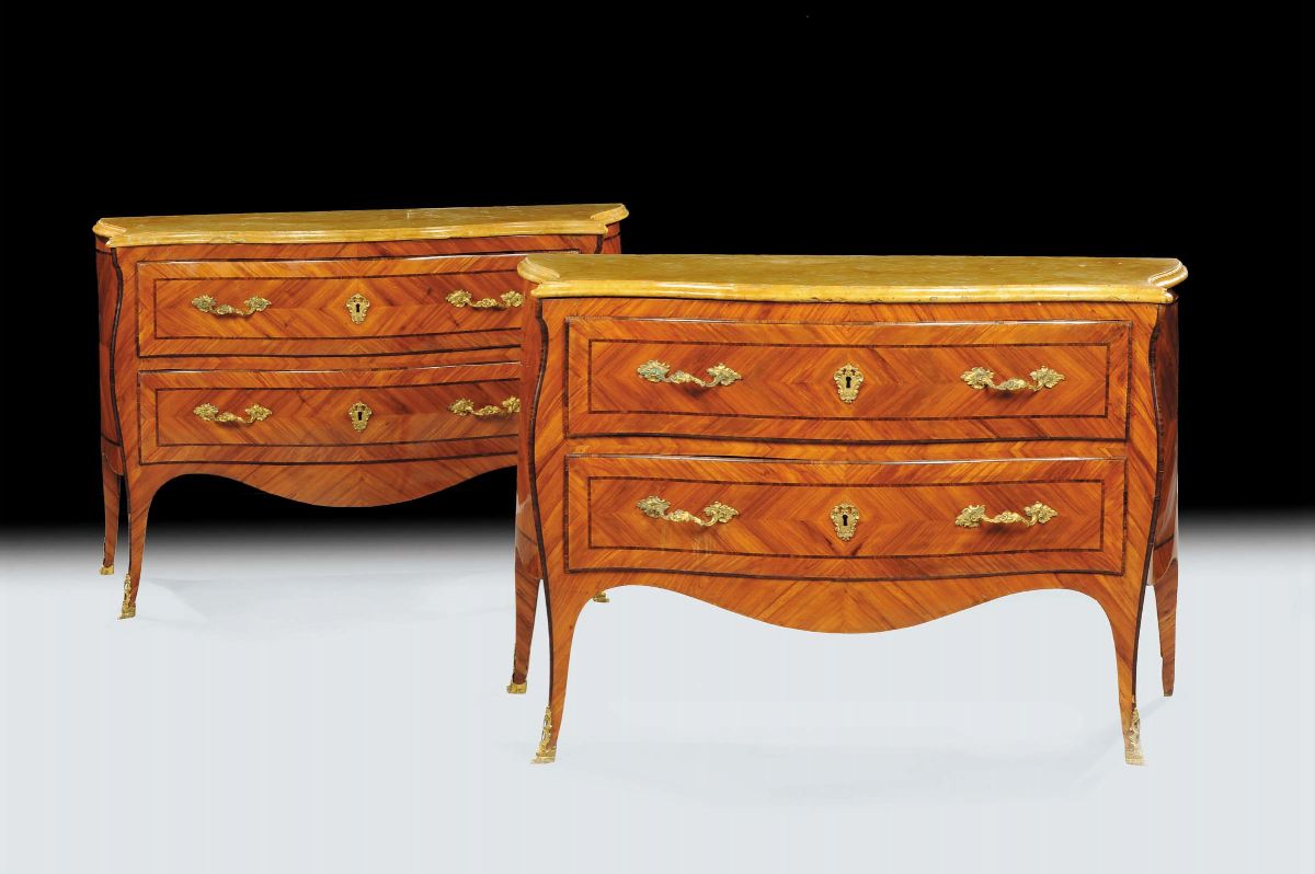 Coppia di cassettoni Luigi XV a due cassetti lastronati a marquetterie in bois de rose, Napoli XVIII secolo