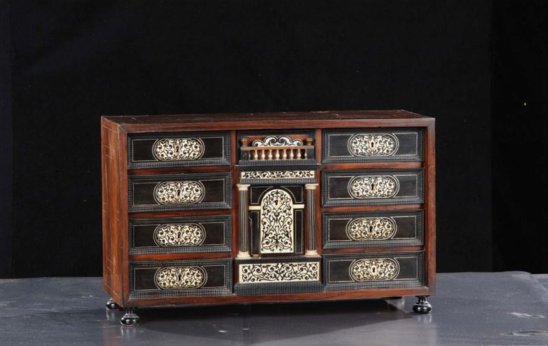 fronte con quattro cassetti incolonnati ai lati ed anta centrale con colonne sfaccettate ai margini e balaustra sulla sommitˆ, ricco decoro in avorio, cm 42x68x27