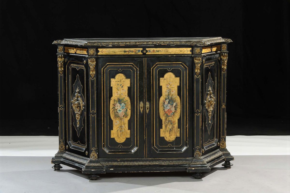 fronte scantonato a due ante dipinte in policromia a motivi floreali su fondo oro, applicazioni di fregi in legno dorato, con alta specchiera in legno ebanizzato e dorato, cm 142x41x105, specchiera cm 185