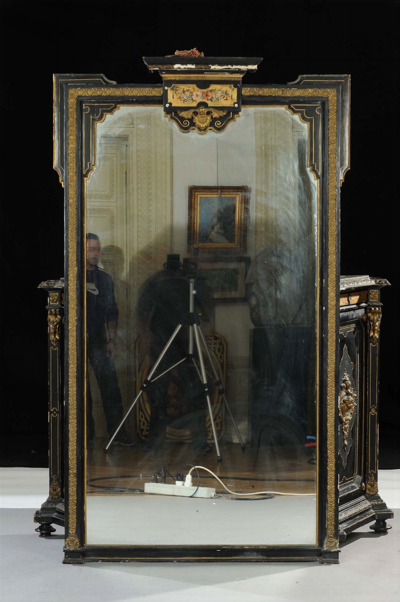 Credenza tipo Boulle in legno ebanizzato con specchiera, XIX secolo