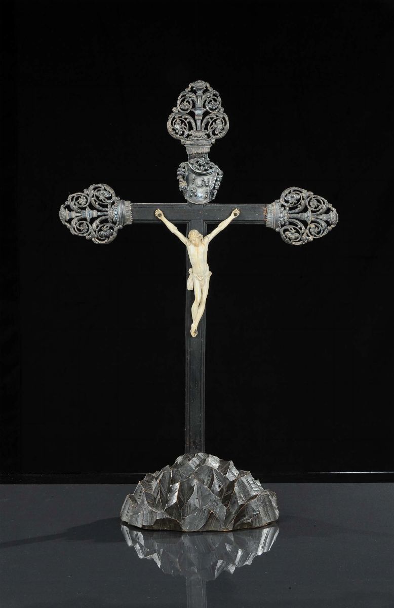 croce in noce ebanizzato con ricchi canti in argento, cm 75x48