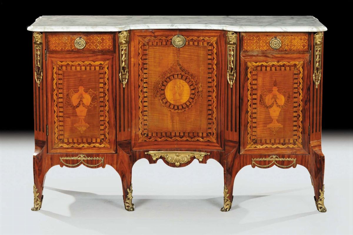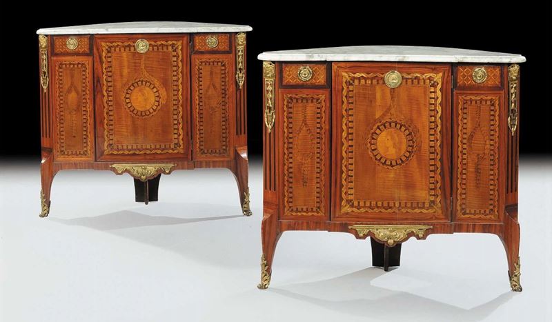 ante decorate a motivi di losanghe e a torciglione, piano in marmo sagomato, applicazioni di bronzo dorato su montanti, grembiule e piedini, cm 143x58x89, angoliere cm 74x74x89