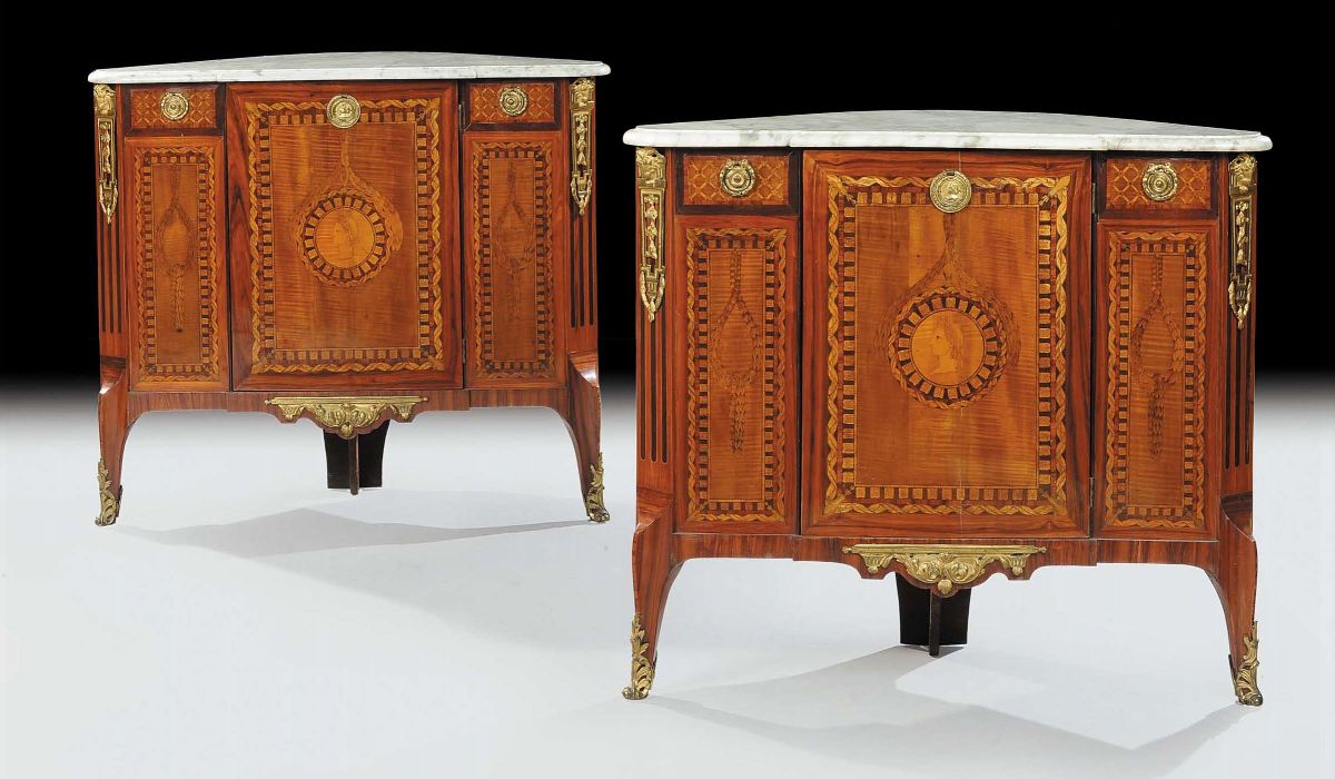 Due angoliere e credenza lastronate ed intarsiate, Olanda XVIII secolo