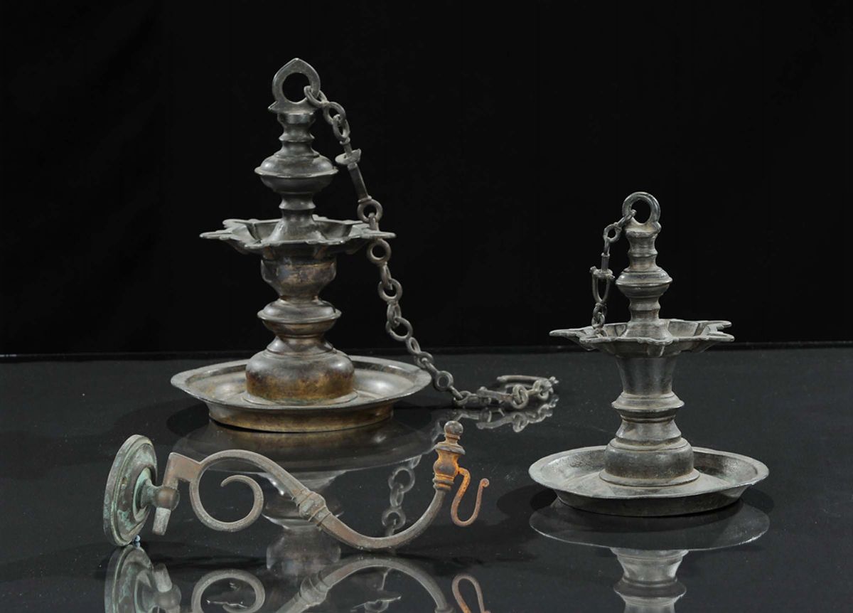 Due lampade Hanukkiah pensili ad olio in bronzo, XIX secolo