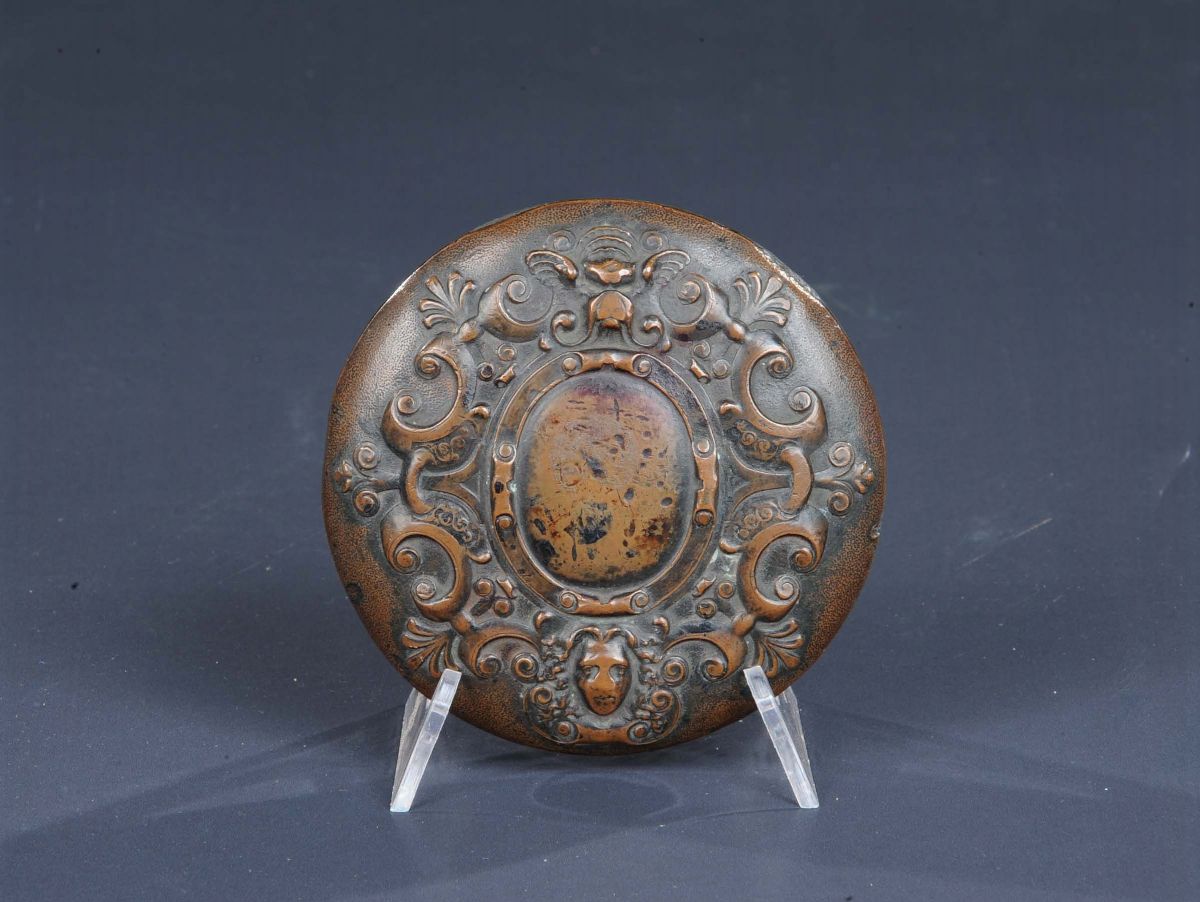 di forma circolare con volute e mascheroni, diametro cm 10