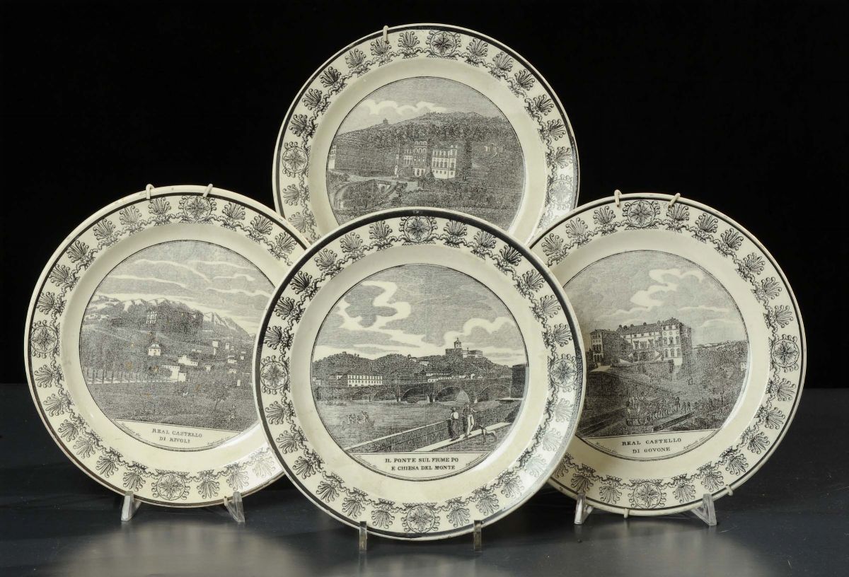 Quattro piatti con decoro a decalcomania, XX secolo
