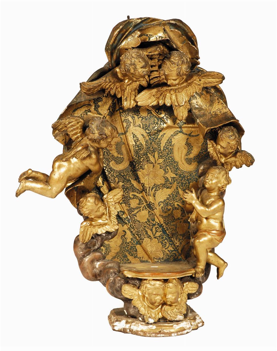 a foggia di tessuto damascato con angioletti e putti alati dorati intagliati a tutto tondo, altezza cm 92