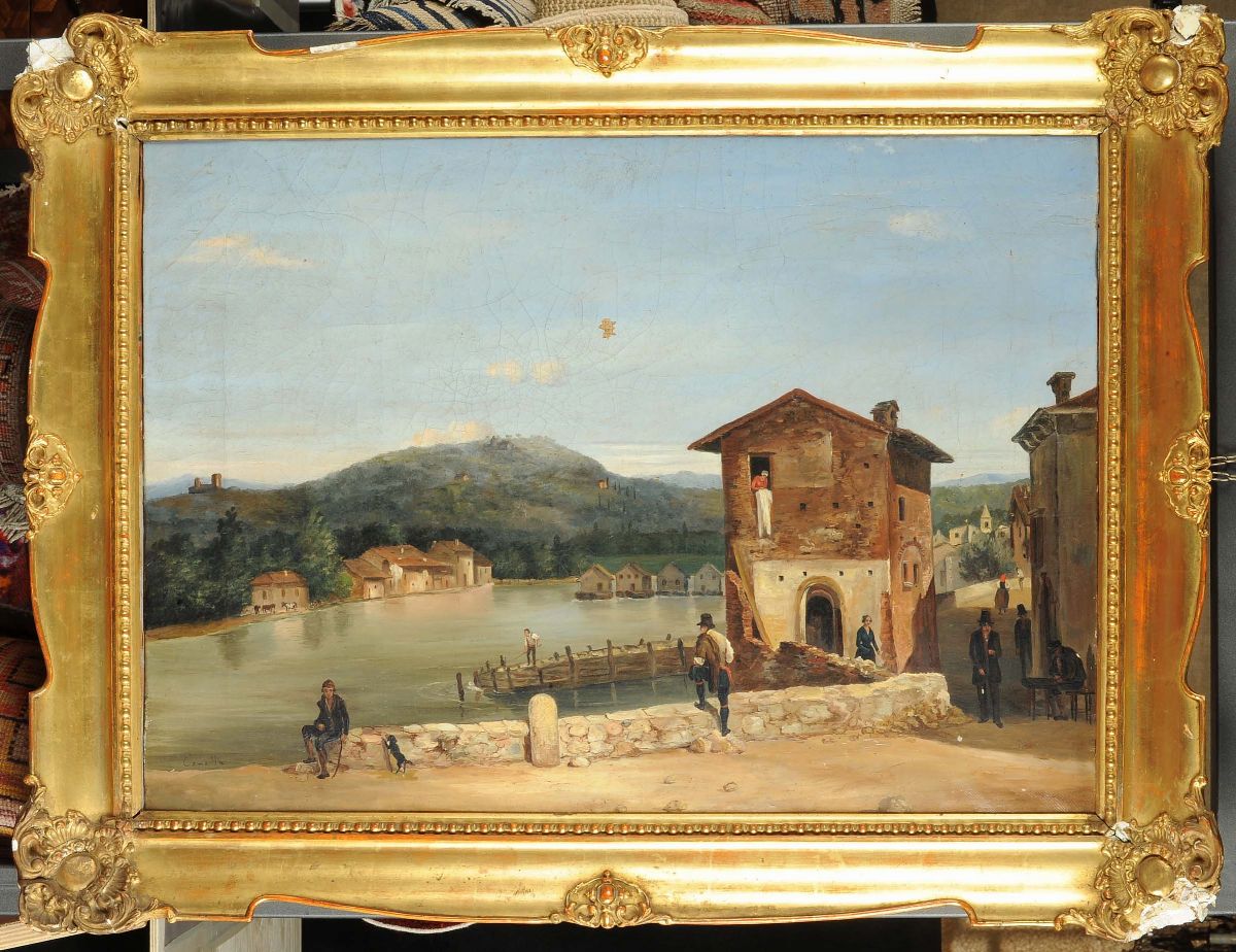 Scuola del XIX secolo Veduta lacustre con scorcio di paese