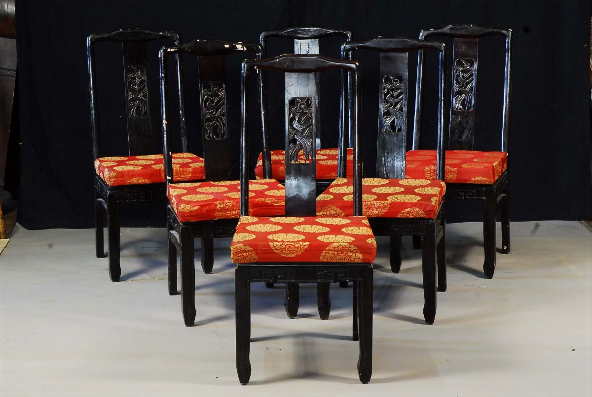 Sei sedie in legno ebanizzato e intagliato, Cina XIX secolo