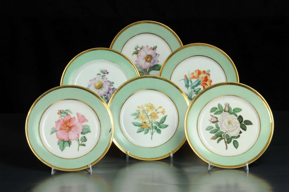 Serie di sei piatti in porcellana policroma, Francia inizio XIX secolo