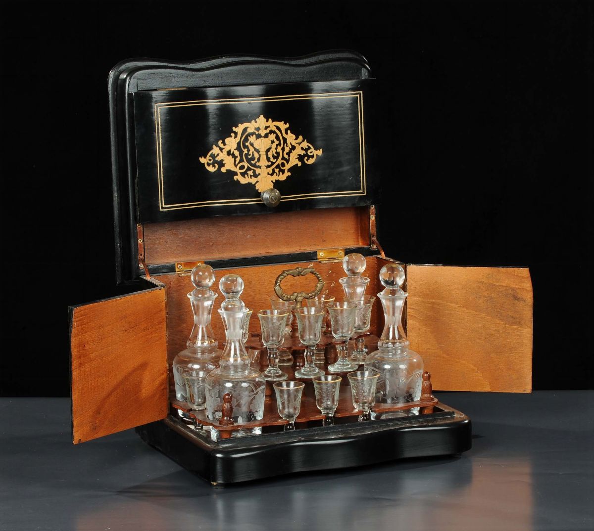 molato e lumeggiato in oro, composto da quattro ampolle con tappo e sedici bicchierini, entro cofanetto da viaggio, cm 36x28x25