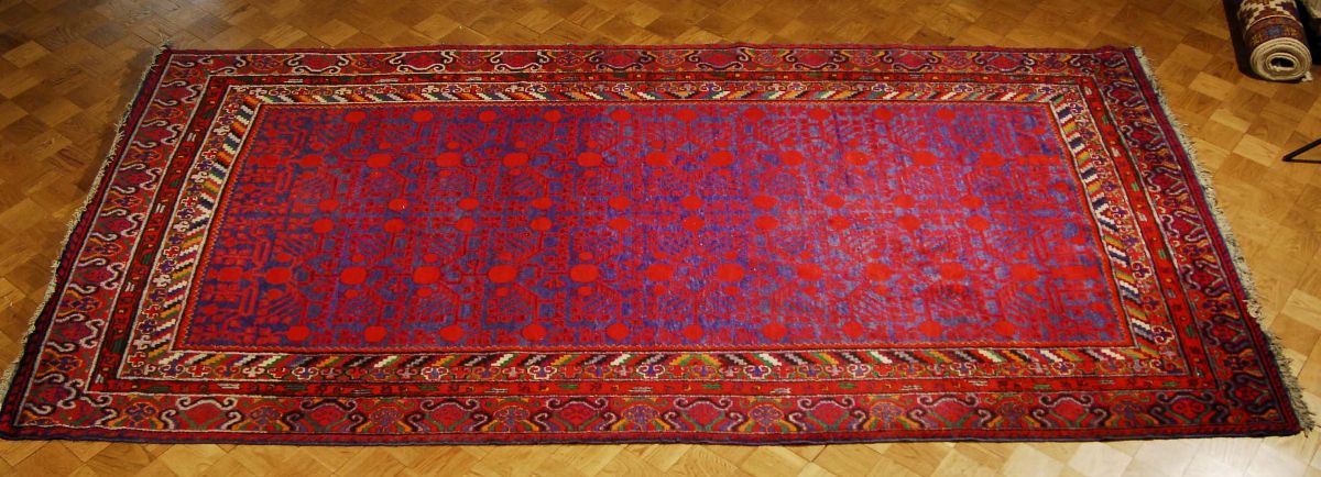 a fondo rosso con decoro a melograno, provenienza Xinjiang, cm 400x200