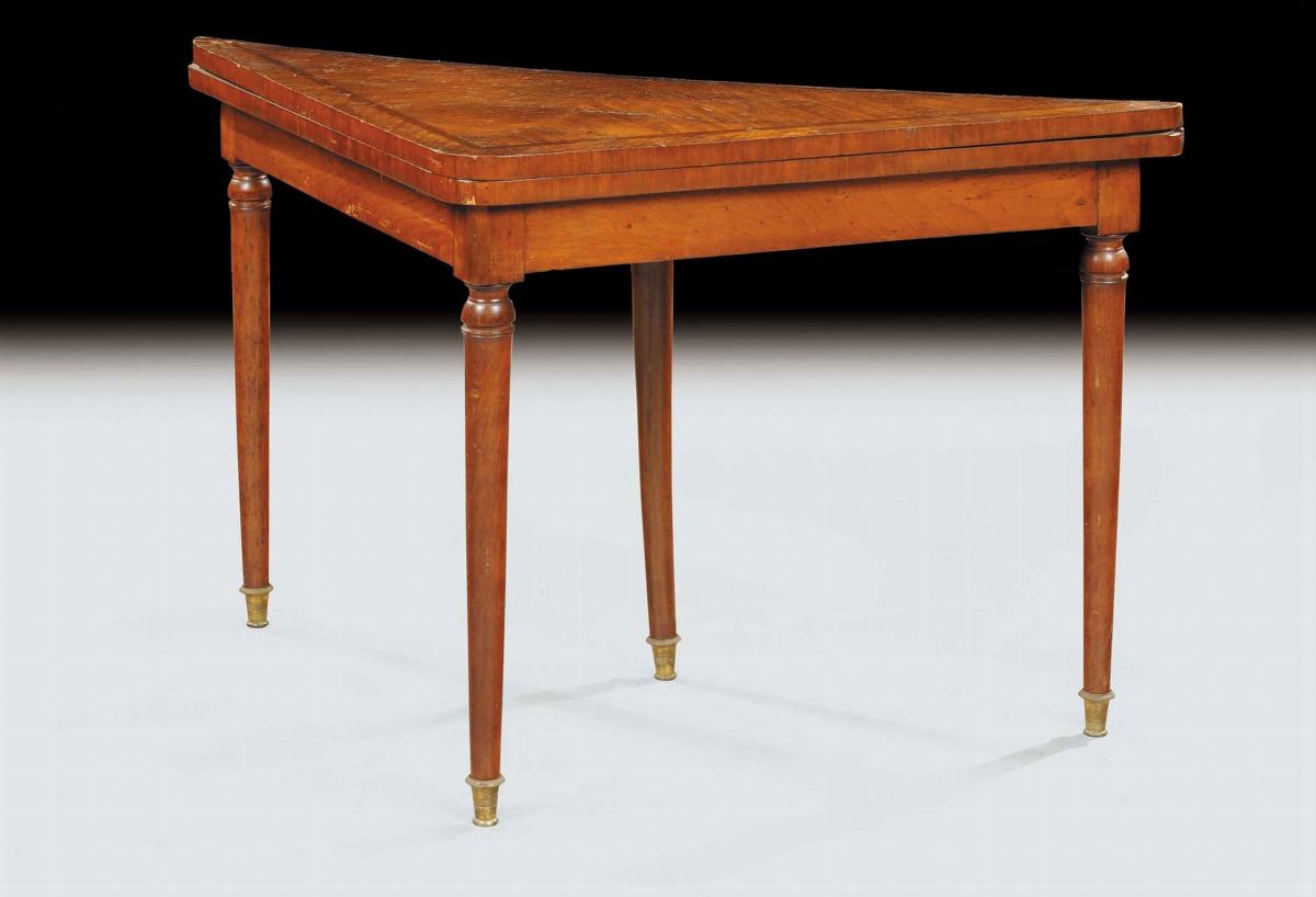 Tavolo da gioco Luigi XVI triangolare lastronato in noce, XVIII secolo