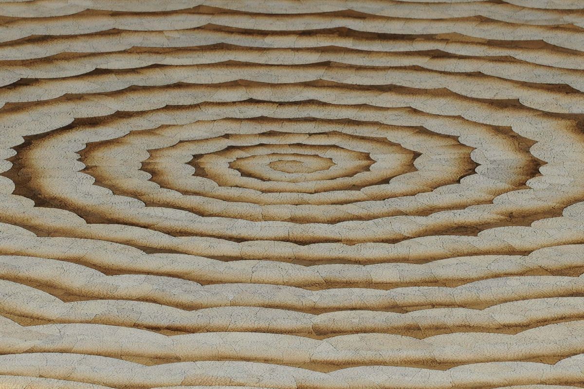 in legno smaltato argento e quattro piedini sferici. Piano a lacca con finitura a guscio d'uovo. Diametro cm 160, altezza cm 77