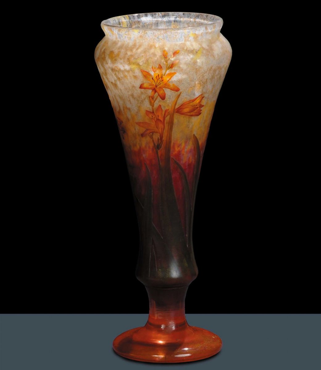 inclusione di polveri vitree bianca ocra e rossa, doppiato in vetro verde, lavorato all'acido, rifinito alla mola e parzialmente dipinto con smalti policromi a caldo. Firma a cammeo: Daum, Nancy e croce di Lorena. Altezza cm 31,5