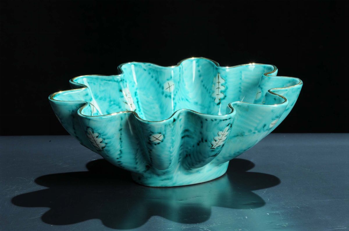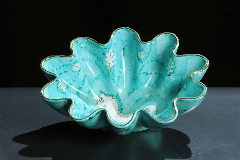 Ciotola ovale polilobata in terracotta modellata a colaggio, maiolicata e dipinta a mano sotto vernice in azzurro e oro. Marchio della manifattura sotto la base. Lunghezza cm 21