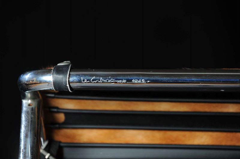 chaise longue a regolazione continua. Struttura in tubolare d'acciaio cromato, imbottitura ricoperta in cavallino, base in metallo tinto nero. Incusso nella struttura: Le Corbusier, LC4, editata da Cassina dal 1965. Cm 161x56