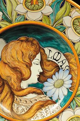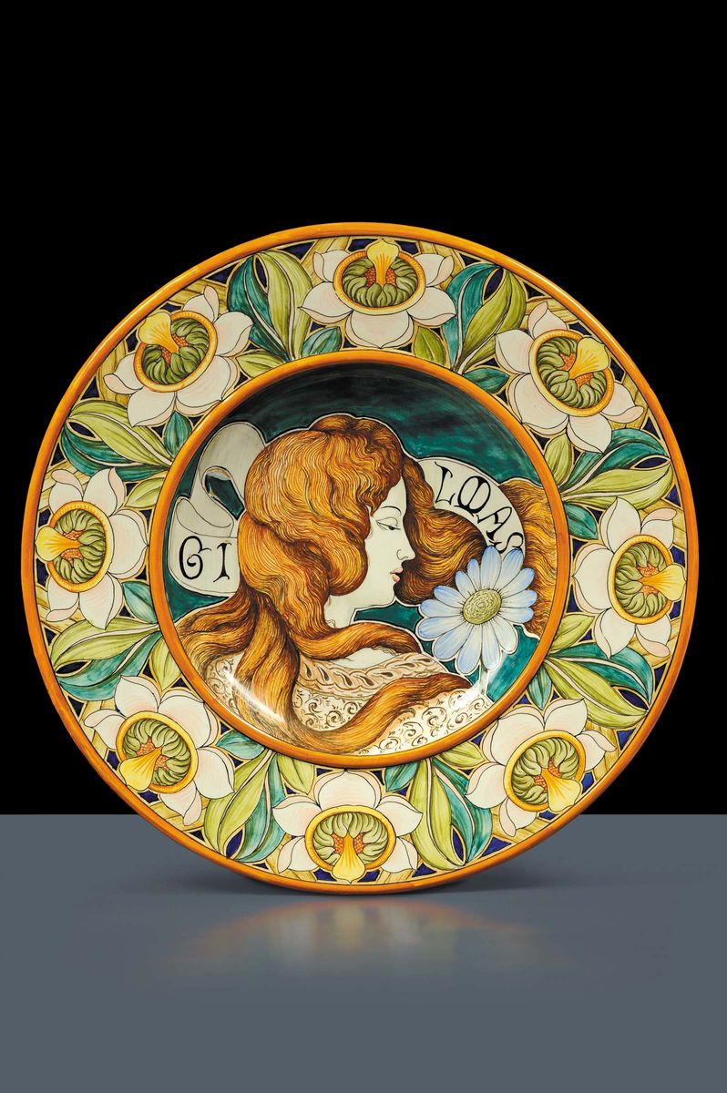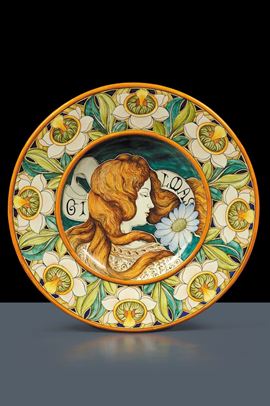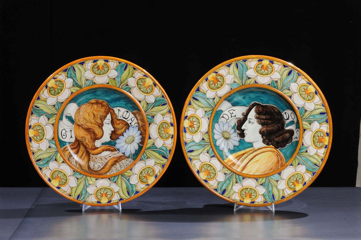 dipinta a mano in policromia raffigurante due profili di personaggi del mito: Demos e Gilmas. Marchio della manifattura sul retro di ciascun piatto. 1910 circa, diametro cm 42