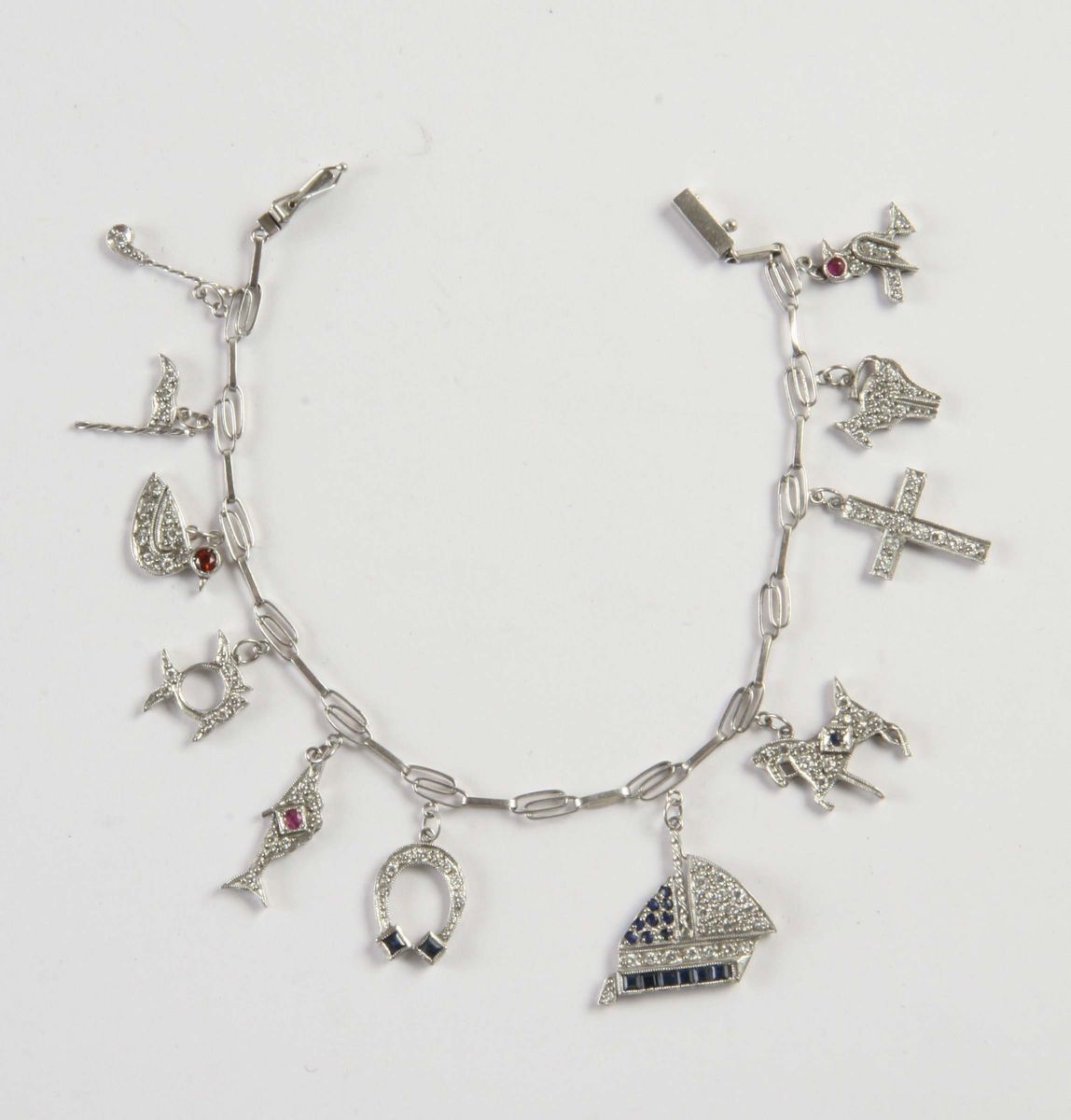 in platino con diamanti, zaffiri e rubini e vari pendenti porta fortuna. Lunghezza cm 17,50