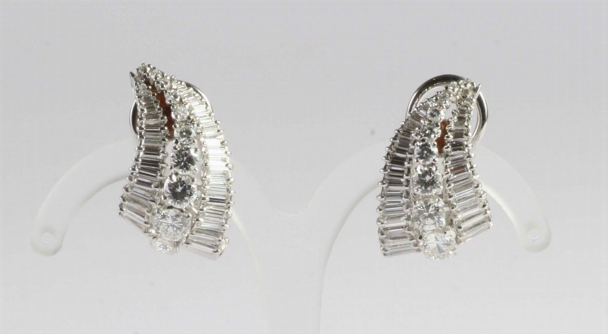 montati in oro bianco 18Kt, chiusura a clips, diamanti taglio tondo e baguette