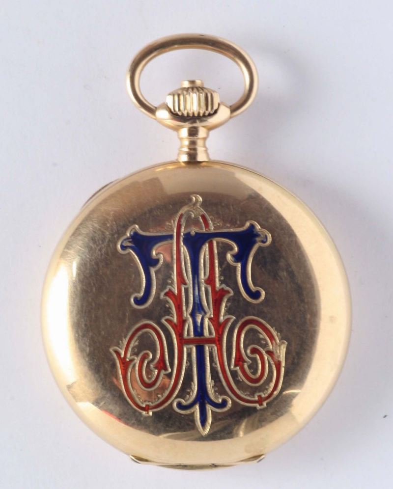 doppia cassa in oro 18Kt con monogramma in smalto, diametro 33mm, (necessita revisione)