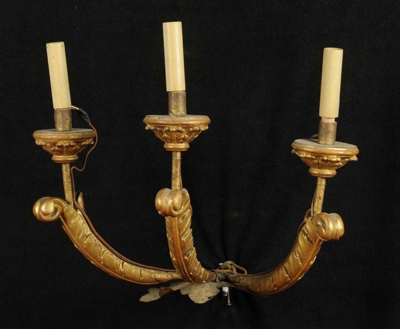 Coppia di appliques a tre bracci in legno intagliato e dorato, XIX secolo