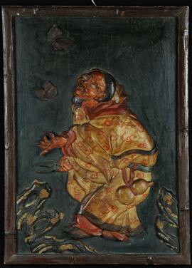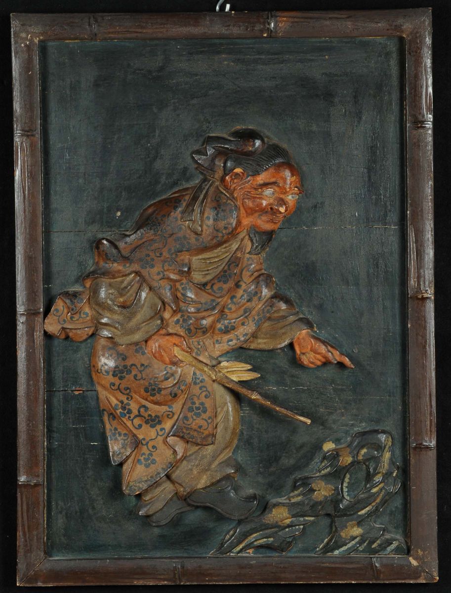 Coppia di pannelli in legno policromo raffiguranti personaggi orientali, Cina XIX secolo