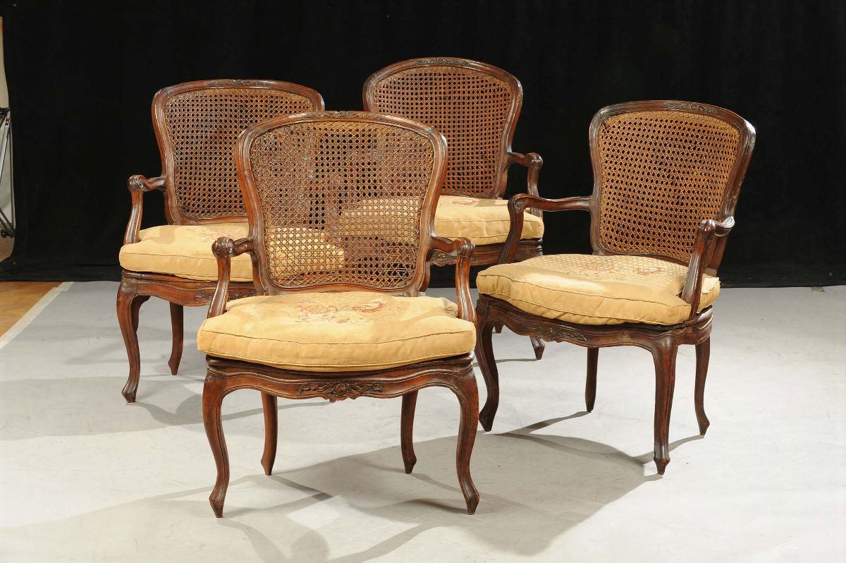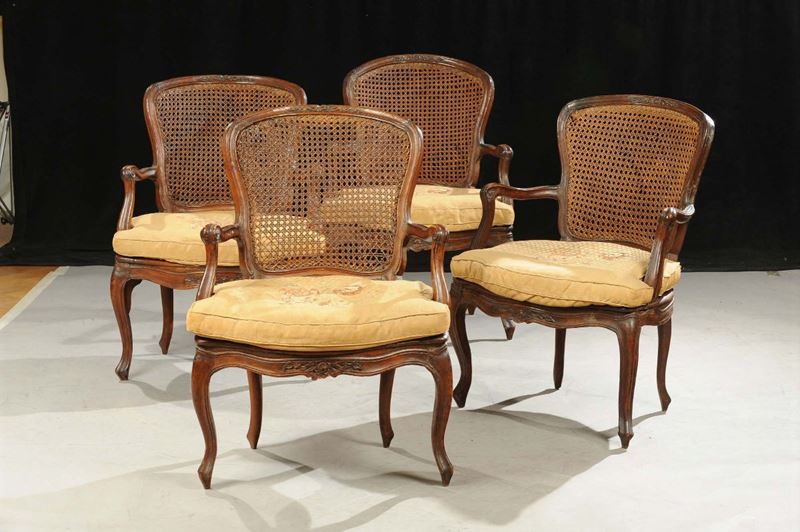 Quattro poltroncine Luigi XV in noce, XVIII secolo