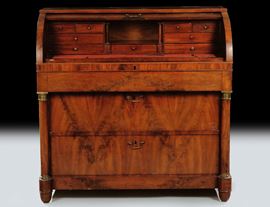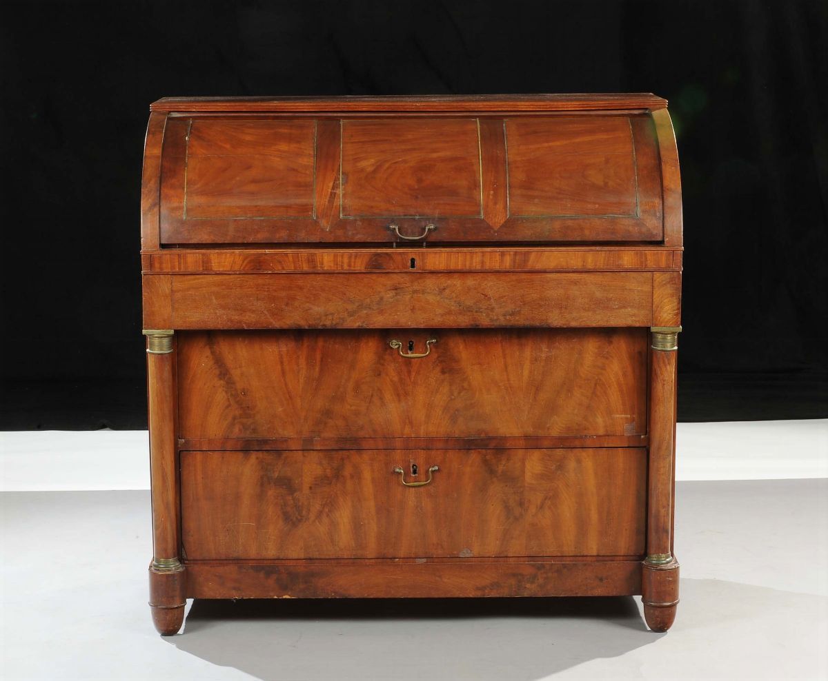 Ribalta a rullo Impero lastronata in noce e radica di noce, XIX secolo