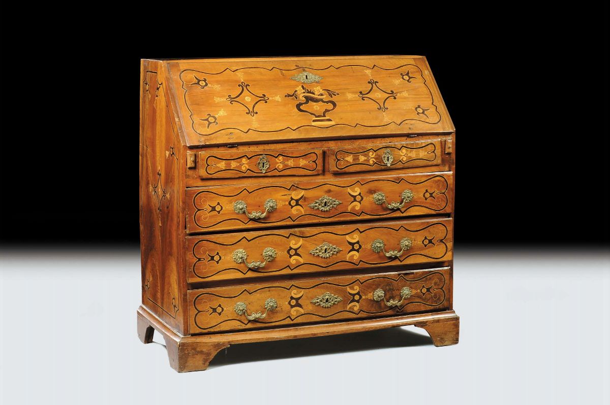 Ribalta Luigi XIV in noce intarsiata e filettata, XVIII secolo