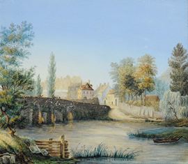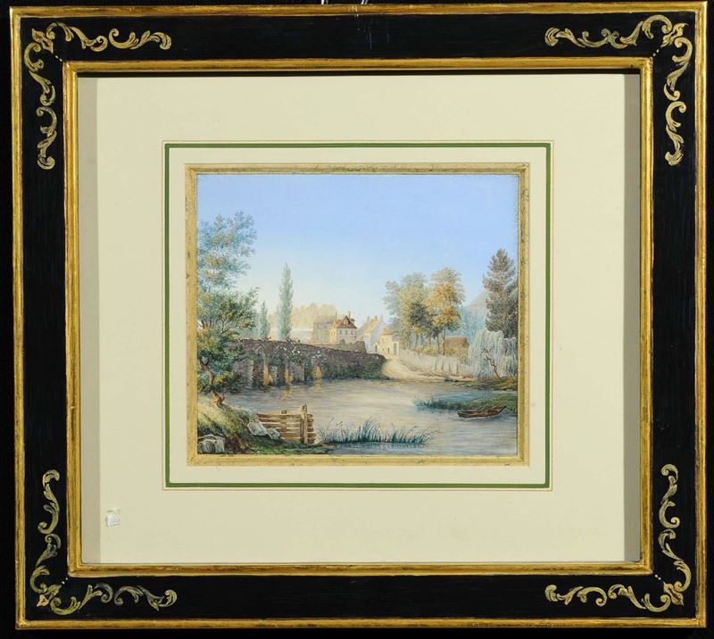Scuola del XVIII secolo Paesaggio con pontePaesaggio con ponte e figure