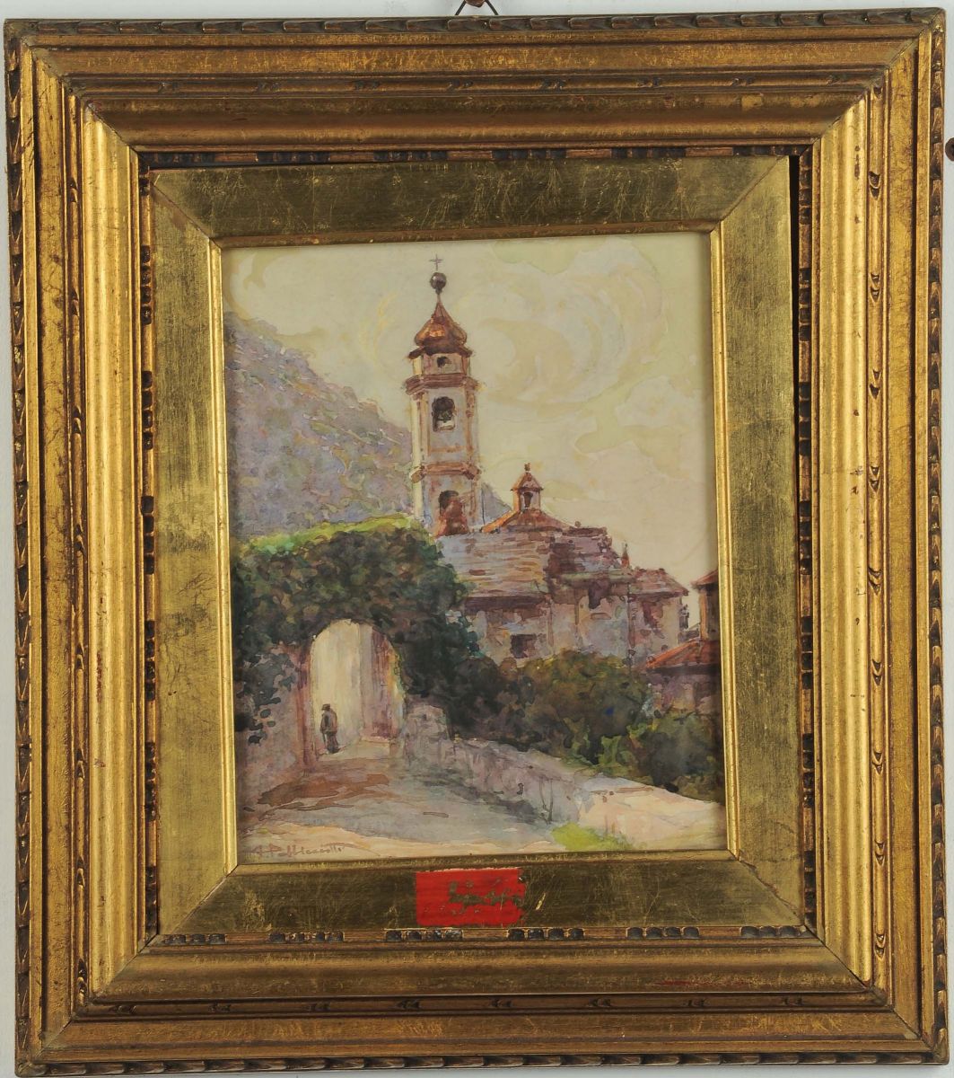Tito Pelliciotti (1872-1950) Paesaggio con chiesa e figure