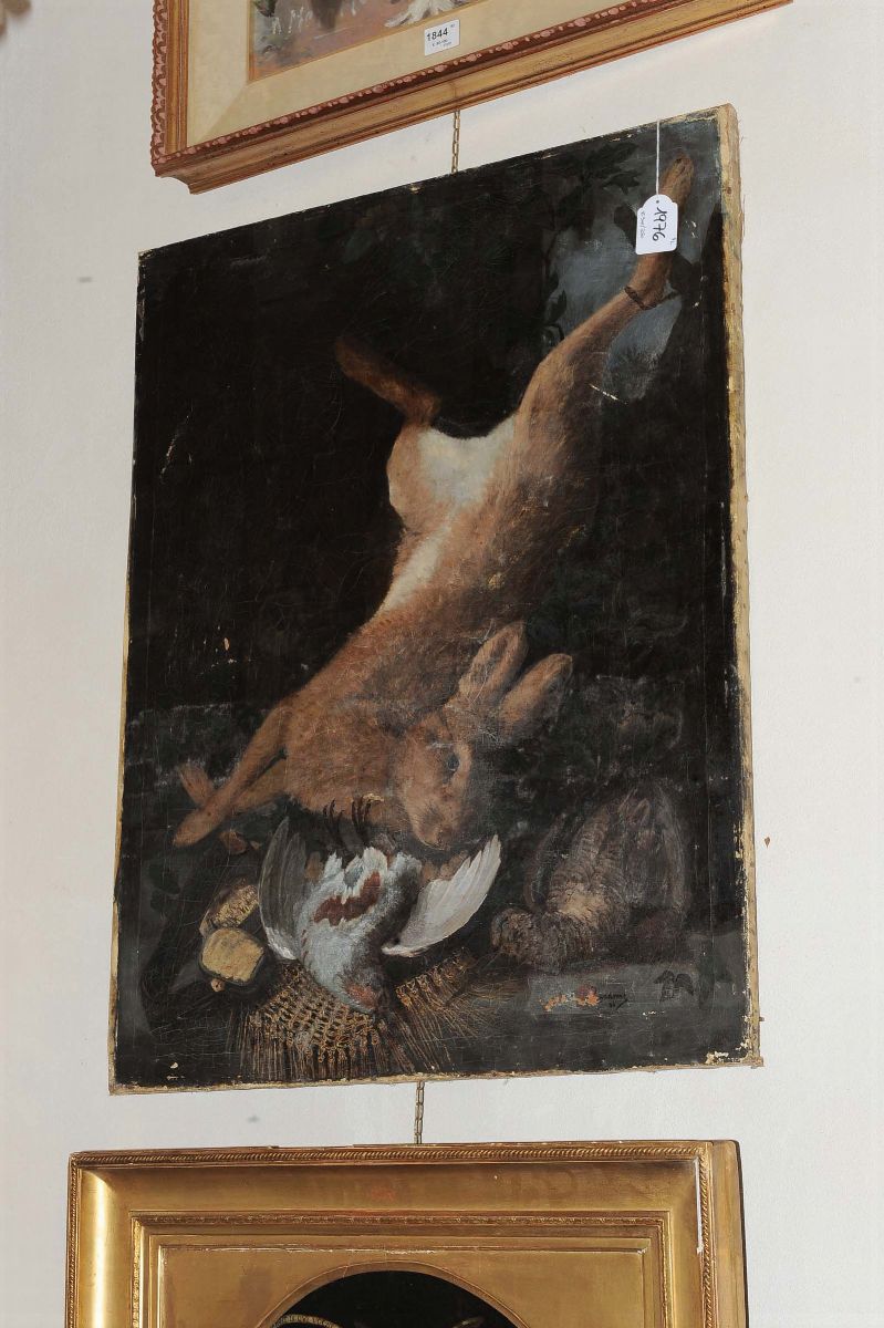 Anonimo del XX secolo Natura morta con coniglio e volatili
