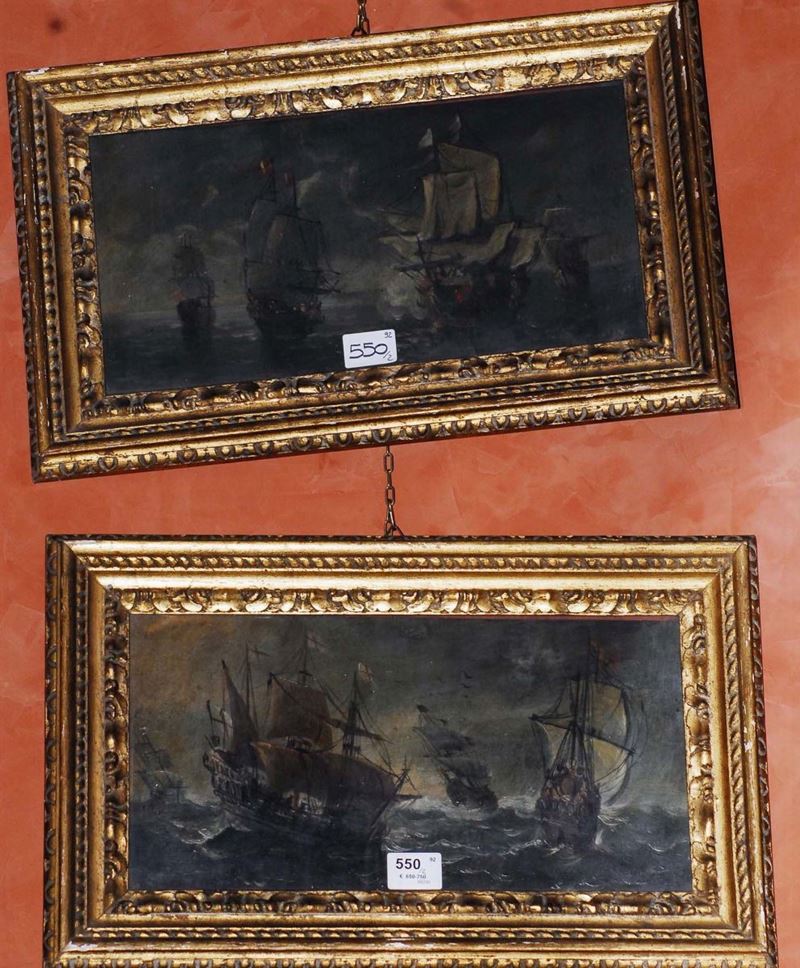 coppia di dipinti ad olio su tavoletta, cm 41x21, in cornici dorate