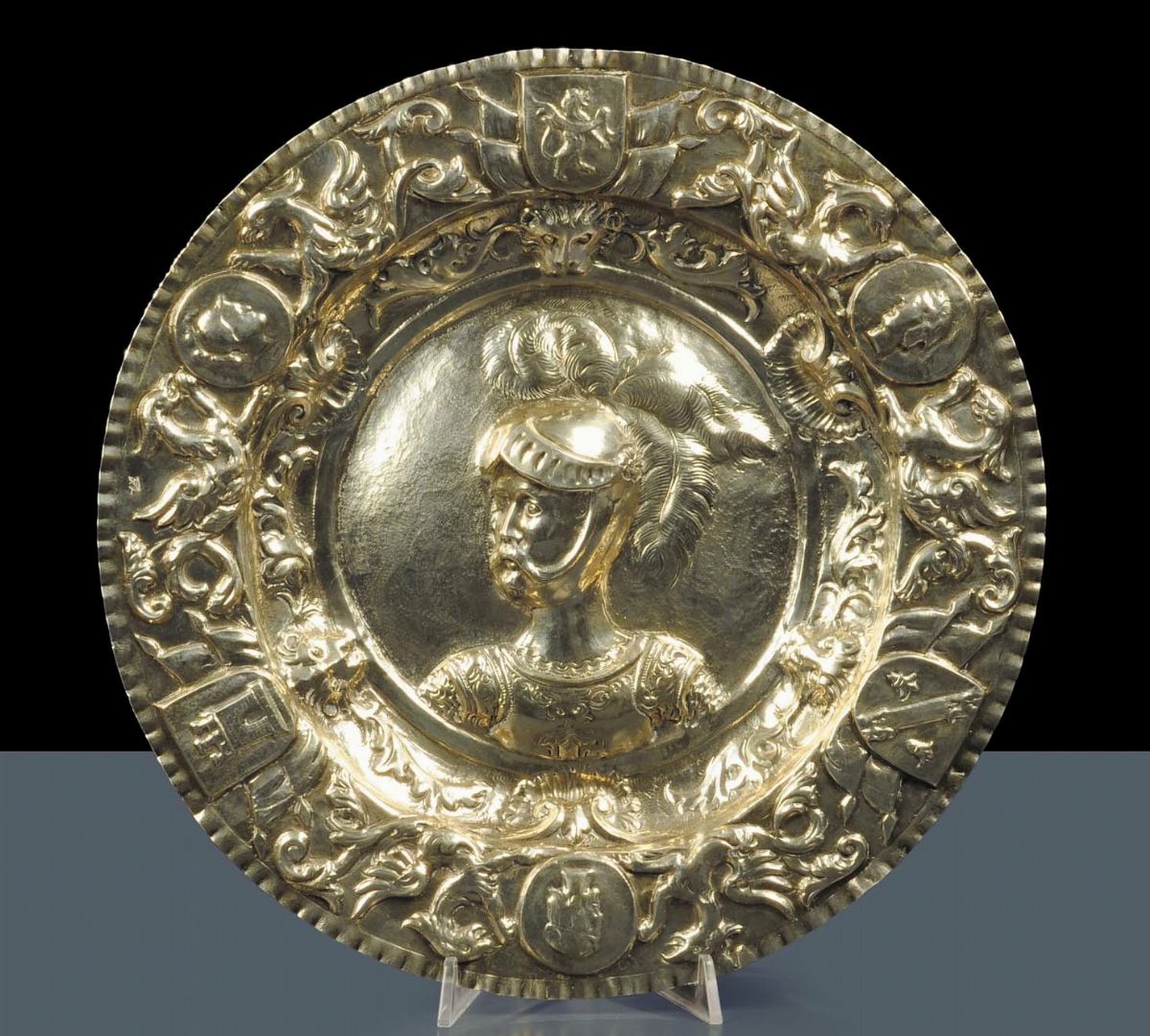 figura di armigero al centro del cavetto, scudi sorretti da aquile nella tesata, diametro cm 36